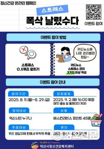 캠페인은 익산시정신건강복지센터 누리집에 게시된 큐알(QR)코드를 통해 스트레스 관련 O·X 퀴즈를 풀고, 제시된 스트레스 관리법 중 3가지 이상을 작성하는 방식으로 진행된다.