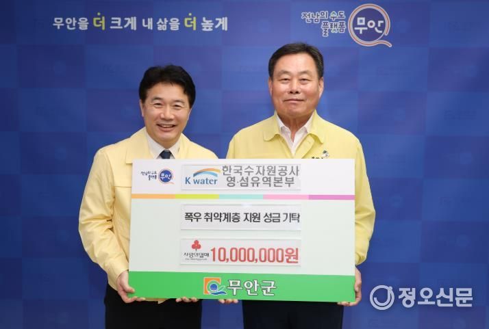 정오신문 관리자 기자 | 전남 무안군은 11일, 한국수자원공사 영·섬유역본부로부터 호우피해 복구, 군민 지원을 위한 성금 1,000만원을 기탁받았다.
