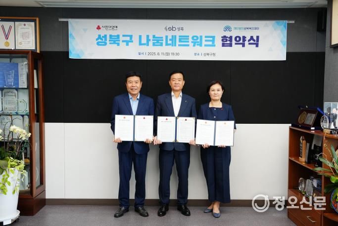정오신문 관리자 기자 | 서울 성북구가 11일 성북복지재단과 서울사회복지공동모금회와 함께 ‘성북구 나눔네트워크’ 협약(MOU)을 체결했다. 이번 협약은 지난 7월 1일 공식 출범한 성북복지재단의 첫 대외 협력으로, 민·관 협력을 통한 촘촘한 복지 안전망 구축과 나눔 문화 확산의 기반이 될 전망이다.