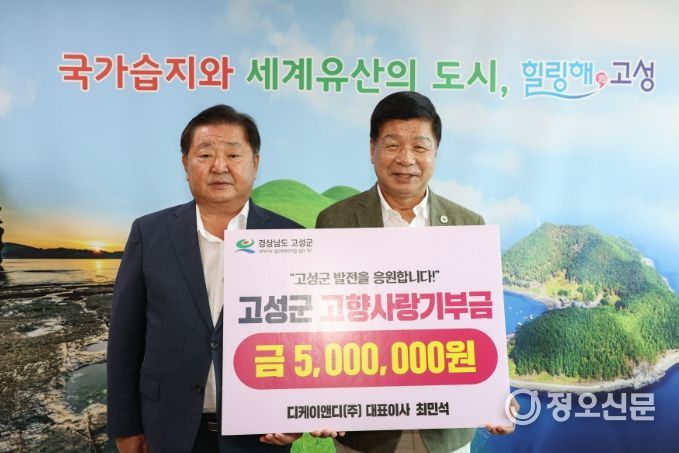 정오신문 관리자 기자 | 고성군은 8월 8일, 코스닥 상장 합성피혁 전문기업 디케이앤디㈜의 최민석 대표이사가 고향사랑기부금 500만 원을 기탁했다고 밝혔다.