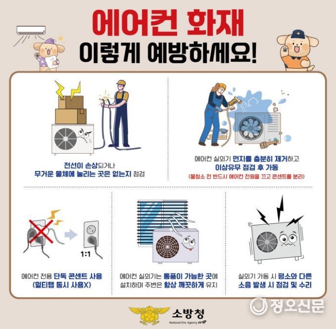 에어컨 화재는 전선 손상, 먼지 축적, 과부하 등으로 발생할 수 있어, 사용 전 △전선 손상 여부 및 무거운 물체에 눌린 부분 점검 △실외기 먼지 제거 및 이상 유무 확인 △전용 콘센트 사용 △통풍이 원활한 장소에 설치 후 주변 청결 유지 △이상 소음 발생 시 즉시 점검·수리 등의 조치가 필요하다.