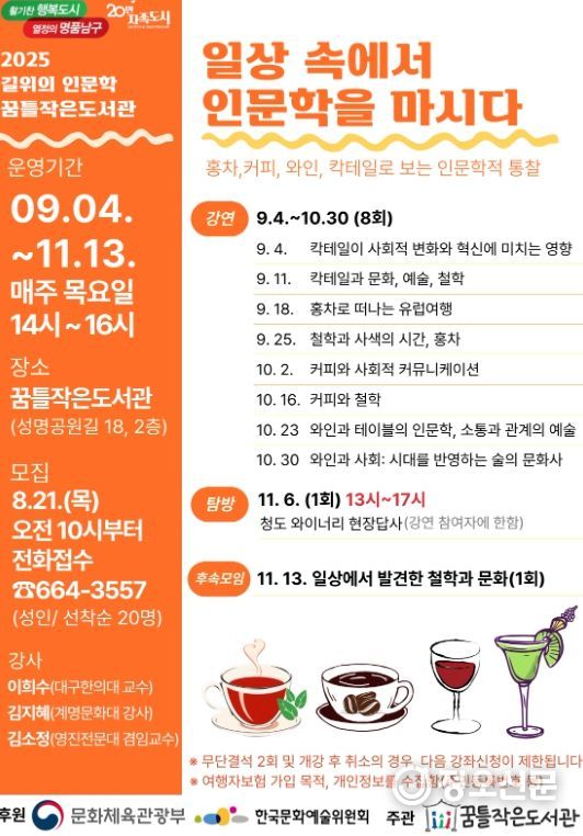 문화체육관광부와 한국문화예술위원회가 공모사업으로 운영하는 이번 프로그램은, ‘일상속에서 인문학을 마시다’라는 주제로 9월 4일부터 11월 13일까지 진행된다.