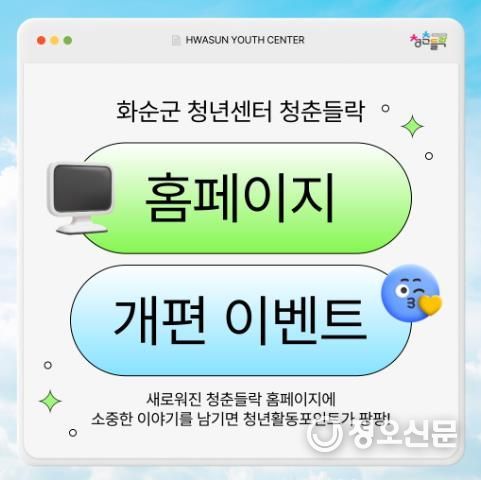 정오신문 관리자 기자 | 화순군은 청년 소통 플랫폼인 ‘청춘들락’ 홈페이지를 전면 개편하고, 이를 기념해 청년 참여 이벤트를 오는 8월 13일부터 24일까지 진행한다고 밝혔다.