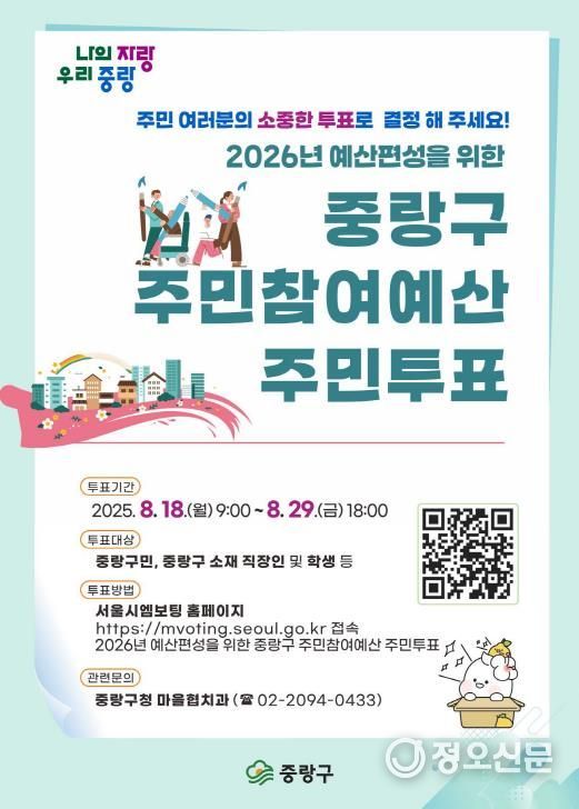 정오신문 관리자 기자 | 중랑구는 8월 18일부터 29일까지 ‘2026년도 중랑구 주민참여예산 온라인 주민투표’를 실시한다.