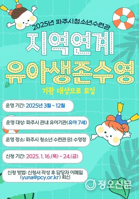 정오신문 관리자 기자 | (재)파주시청소년재단 파주시청소년수련관은 2025년 3월부터 진행되는 “지역연계 유아 생존수영” 프로그램의 참가할 유아기관을 1월 16일부터 24일까지 모집한다.