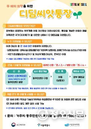 정오신문 관리자 기자 | 금천구는 취약계층 아동의 자립에 필요한 목돈 마련을 돕는 디딤씨앗통장 가입대상을 확대 지원한다고 밝혔다.