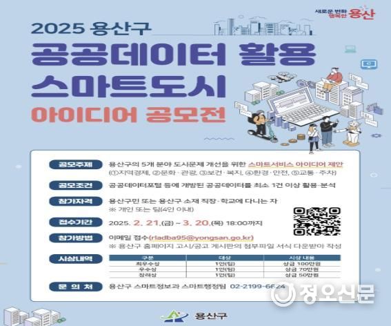 정오신문 관리자 기자 | 서울 용산구가 내달 20일까지 ‘2025년 용산구 공공데이터 활용 스마트도시 아이디어 공모전’을 개최한다.