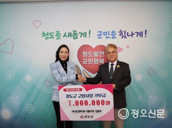 정오신문 관리자 기자 | 청도군은 지난 25일 더나은컴퍼니(주) 김윤희 대표가 청도군을 사랑하는 마음을 담아 고향사랑기부금 100만 원을 전달했다고 밝혔다.