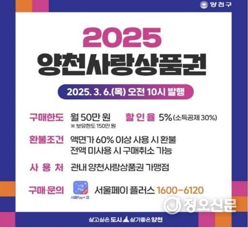 구는 지난 1월 설을 앞두고 60억 원 규모의 양천사랑상품권을 발행한 바 있으며, 이번에 40억 원을 예정보다 앞당겨 추가 발행하기로 했다. 1분기 내 100억 원 규모를 전체 발행해 장기화된 경기침체로 타격을 입고 있는 민생경제에 활력을 불어넣는다는 계획이다.