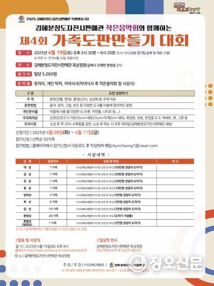 정오신문 관리자 기자 | 김해도예협회는 4월 19일 오후 5시 30분 김해분청도자전시판매관 옥상정원에서 가족 단위 참가자를 대상으로 ‘제4회 가족도판 만들기 대회’를 개최한다고 밝혔다.