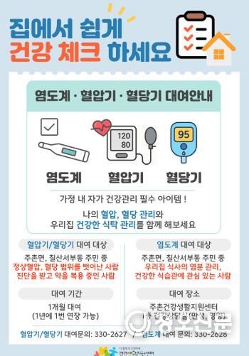 기기 대여는 주촌면·칠산서부동 지역 주민 우선 대상이며, 주촌건강생활지원센터 1층 건강상담실(만성, 영양)에서 진행된다.
