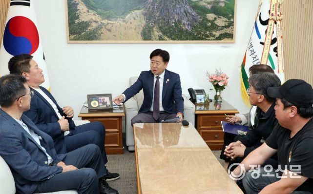 오영훈 지사는 11일 오전 도청 집무실에서 김병수 동복리장을 비롯한 동복리 마을회 관계자들과 면담을 갖고 앞으로의 협력방안을 논의했다.