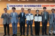 정오신문 관리자 기자 | 대구문화예술진흥원과 국립대구과학관은 8월 6일 국립대구과학관에서 지역사회 과학 문화 확산과 문화예술 진흥을 위한 업무협약(MOU)을 체결했다. 이번 협약을 통해 양 기관은 △프로그램 및 시설 공동 운영과 상호 활용 △특별기획전·상설전시 등 상호 전시 콘텐츠 교류 및 공동 기획 △온·오프라인 홍보 매체를 활용한 유기적 홍보 협력 등 다양한 분야에서 실질적인 협력 체계를 구축할 계획이다. 박순태 대구문화예술진흥원장은 “지역을 대표하는 두 기관의 협력을 통해 시민들의 문화 향유와 삶의 질 향상에 크게 기여하길 기대한다”며, “앞으로도 문화예술과 과학의 시너지를 바탕으로 지역 문화 발전을 위한 공동의 노력을 이어가겠다”고 전했다. 이난희 국립대구과학관장은 “이번 협약은 과학을 문화 예술 속에 자연스럽게 녹여 지역민이 친숙하게 과학 문화를 접할 수 있는 계기가 될 것”이라며, “전시, 홍보, 프로그램 운영 등 다양한 협력 사업을 통해 지역의 과학 문화 확산이 활발히 이뤄지길 바란다”고 말했다. 협약식 이후, 양 기관 임직원들은 국립대구과학관의 특별기획전 ‘보이지 않는 우주’ 개막식