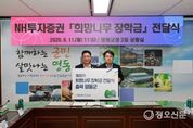 정오신문 관리자 기자 | 충북 영동군은 11일 NH투자증권이 영동군에 ‘희망나무 장학금’ 1,500만 원을 전달했다고 밝혔다. 이번 장학금은 군을 통해 관내 저소득층 중·고등학생 10명에게 지원될 예정이다. 이날 오전 영동군청 상황실에서 열린 전달식에는 임철순 NH투자증권 ESG본부장과 정영철 영동군수를 비롯한 관계자들이 참석했다. NH투자증권은 지난 2005년부터 농촌지역 저소득 가정의 중·고등학생 40여 명을 선발해 장학금을 지원해왔다. 올해부터는 더 많은 학생을 지원하기 위해 농촌지역 지자체별로 10명의 중·고등학생을 선정해 장학금을 전달하고 있다. 올해는 총 5개 지자체에서 지원하며, 영동군은 그중 하나로 선정됐다. 내년부터는 지원 지자체를 8곳으로 확대할 계획이라고 밝혔다. NH투자증권은 장학사업뿐 아니라 농촌 취약계층 지원, 지역사회 발전사업, 환경보호 활동 등 폭넓은 사회 공헌을 이어가고 있다. 임철순 본부장은 “희망나무 장학금은 농촌지역 학생들이 꿈을 포기하지 않고 미래를 향해 나아가도록 돕는 뜻깊은 사업”이라며 “앞으로도 교육 복지 향상과 지역 인재 육성을
