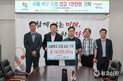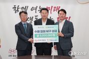 정오신문 관리자 기자 | ㈜에스앤씨산업과 거남복지재단이 집중호우로 피해를 본 당진 시민들을 위해 성금 500만 원을 기탁했다. 기탁식은 8월 5일 당진시청 7층 접견실에서 열렸으며, 에스앤씨산업 이대호 대표와 거남복지재단 이충섭 대표가 참석해 당진시에 성금을 전달했다. 이대호 대표는 “갑작스러운 폭우로 어려움을 겪고 있는 이웃들에게 위로와 희망이 전해지길 바란다”며 “기업의 사회적 책임을 다하는 차원에서 앞으로도 지역과 함께하는 나눔 활동을 이어가겠다”고 말했다. 오성환 당진시장은 “어려운 시기에 지역을 먼저 생각해 주신 따뜻한 손길에 깊이 감사드린다”며 “기탁해 주신 성금은 침수 피해를 겪은 시민들의 실질적인 복구와 지원에 소중히 쓰겠다”고 전했다.